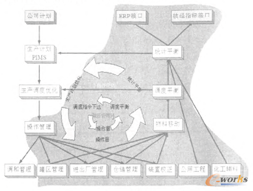 MES系統即“生產執行指揮系統”,是以企業生產物流管理為核心,以數據集成平臺和核心數據庫為支撐,集實時數據集成、物料移動信息管理、生產調度管理、生產統計管理、能源管理、KPI績效、綜合展示為一體的石化行業生產執行管理業務集成系統。MES系統在泰州石化成功上線后,在系統數據集成平臺的支撐下,生產業務貫通了從生產裝置、罐區到調度再到統計的生產過程數據管理全流程,彌合了管理層和生產過程控制層之間信息及時傳遞的間隙。通過系統的物流跟蹤、超差報警,操作人員可以對操作錯誤進行及時糾正;通過系統對數據源的統一管理,加強了不同業務部門之問的協同工作能力,實現了調度與統計數據的一致性,大大提高了工作效率。系統為生產調度排產系統提供罐情數據,有力地支持了調度排產優化,為公司ERP系統提供了及時、準確的數據支撐,實現了“日平衡、旬確認、月結算”。MES流程如圖3所示。