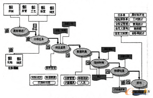 泰州石化質檢中心承擔著泰州石化分公司從原材料進廠到產品出廠全過程的檢驗檢測和技術開發任務,年做樣量約10萬個、40多萬個分析數據。2010年公司上線了美國Thermo Electron公司出品的實驗室信息管理系統(LIMS),基本實現了主要實驗分析儀器設備的自動化運行,加快了實驗室的工作周期,規范了實驗室分析業務流程和信息化管理,最大程度地減少了人為因素的干擾,確保分析數據的真實可靠,實現分析數據的快捷共享。LIMS系統流程如圖6所示。