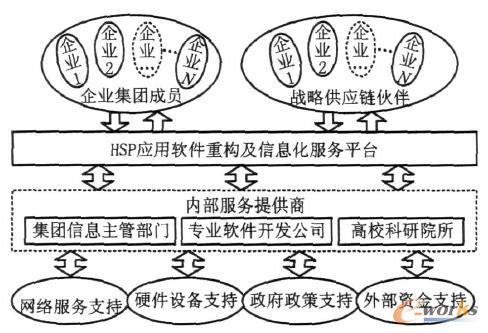 (2) 應(yīng)用服務(wù)層 應(yīng)用服務(wù)層是HSPs的支撐層,該層又可以分為HSPs信息化服務(wù)平臺層和應(yīng)用服務(wù)器層。HSPs信息化服務(wù)平臺層主要為企業(yè)提供可重構(gòu)的應(yīng)用軟件和應(yīng)用軟件的運行、維護環(huán)境,以及相關(guān)的信息化服務(wù);應(yīng)用服務(wù)器層是用于開發(fā)、配置和管理大規(guī)模應(yīng)用系統(tǒng)的中間件平臺,同時也具有確保將這些應(yīng)用系統(tǒng)與原有系統(tǒng)、數(shù)據(jù)進行集成的能力。