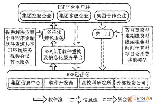 HSPs的運營模式如圖1所示。HSPs模式的主要支撐部分是內(nèi)部服務(wù)提供商(HomeServiceProvider,HSP)和由其運營的應(yīng)用軟件重構(gòu)及信息化服務(wù)平臺。HSP由集團信息主管部門、專業(yè)軟件開發(fā)公司和高?蒲性核热覇挝唤M成,以股份有限公司的形式存在和運行,三家單位按比例參股,享受股東權(quán)利,執(zhí)行股東義務(wù)。集團信息主管部門控制51%以上的股份,負(fù)責(zé)公司的日常運營工作,直接受集團公司董事會領(lǐng)導(dǎo),對總經(jīng)理負(fù)責(zé)。HSP通過應(yīng)用軟件重構(gòu)及信息化服務(wù)平臺,為企業(yè)用戶提供業(yè)務(wù)規(guī)劃,信息規(guī)劃,信息系統(tǒng)的構(gòu)建、重構(gòu)、集成,系統(tǒng)的實施和維護等面向企業(yè)信息化生命周期的全程服務(wù)。