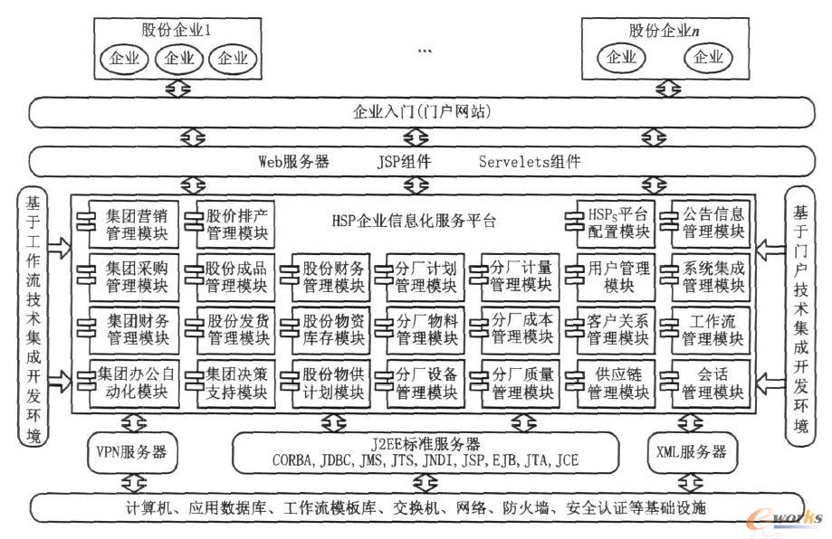 (1)應(yīng)用門戶層 該層是企業(yè)進入HSPs的接入層,企業(yè)根據(jù)HSP分配的用戶名和密碼登錄服務(wù)平臺,選擇適合本企業(yè)的服務(wù)。HSP主要服務(wù)的對象是企業(yè)集團成員,即子公司、控股公司、參股公司。為滿足各類用戶的需求,允許用戶以多種形式接入實體,如固定PC機和移動PC機、工作站、PDA(per sonal digital assistant) 等。
