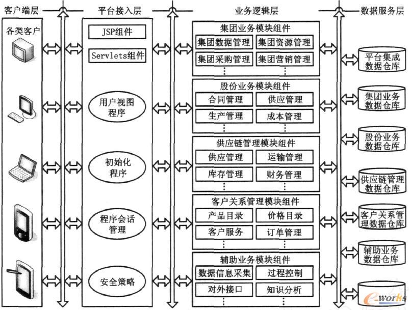 (3) 業(yè)務(wù)邏輯層 業(yè)務(wù)邏輯層是平臺的核心,實現(xiàn)應(yīng)用系統(tǒng)所有主要的業(yè)務(wù)邏輯。業(yè)務(wù)邏輯組件是根據(jù)現(xiàn)實業(yè)務(wù)抽象出一個個獨立的業(yè)務(wù)活動對象,主要包括集團業(yè)務(wù)模塊、股份業(yè)務(wù)模塊、供應(yīng)鏈管理模塊、客戶關(guān)系管理模塊、供應(yīng)關(guān)系管理模塊等。業(yè)務(wù)邏輯層對具體業(yè)務(wù)進行封裝,以便公用。定義完善的對外接口使每個業(yè)務(wù)組件相對獨立,對某個業(yè)務(wù)進行修改和新增業(yè)務(wù)組件不會影響整個系統(tǒng)架構(gòu)。
