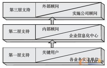 第三層,外部顧問,也可以稱之為運維顧問,是ERP實施公司的專業(yè)技術(shù)人員。主要在宏觀上提出問題的解決方案,與內(nèi)部顧問一起實施業(yè)務(wù)優(yōu)化的方案,指導(dǎo)內(nèi)部顧問解決用戶的問題,并實現(xiàn)知識轉(zhuǎn)移,以及當用戶對ERP有新的功能需求時,進行相應(yīng)的模塊開發(fā)。