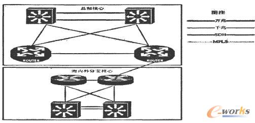核心骨干網的設計包含了集團總部及海內外大型分支、生產基地的網絡互聯模型,集團總部采用高端高性能交換機作為企業的核心交換,兩臺核心交換通過TRUNK萬兆接口互連,采用VRRP協議的可靠性配置與核心路由器互連。核心路由之間通過千兆互連,與分支機構采用SDH專線和MPLS.VPN專線做廣域網的互連冗余結構,SDH和MPLS廣域網鏈路可根據實際費用去選擇。分支機構核心交換和路由的互連與集團核心交換和路由結構相同,只是設備性能要求較低。使用OSPF路由協議,并將核心的路由全部動態發布到Area0區。