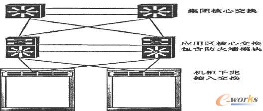 數據中心網絡的設計包含了研發和公共應用服務兩大部分,兩個區域的數據都是企業安全性要求較高的,因此采用帶防火墻業務板的高端交換作為核心交換與集團核心交換全冗余交叉互連,既保證了可靠性也保證了安全性。機房的每個機柜都放置高性能的千兆接入交換,簡潔、美觀且實用。