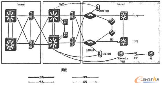 互聯網及VPN網絡包含集團Internet、DMZ、營銷服務網點、移動用戶VPN網絡,由于現實部署中,防火墻交叉鏈路在現網中存在故障,因此此網絡架構模型為理想設計狀態,模型設計如圖2.4:
