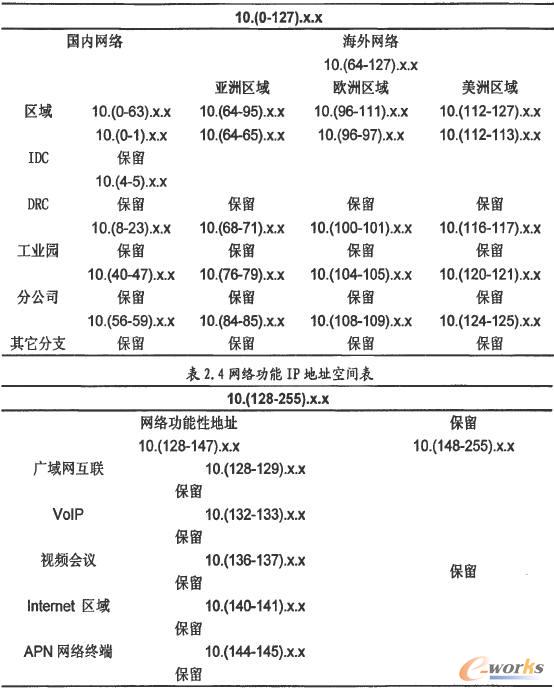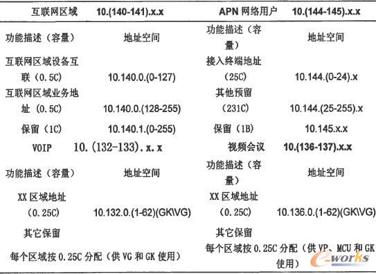 表2.5及表2.6詳細規說明了應用服務區、互聯網、VOIP、視頻會議、設備及APN專用網IP地址的規劃細節情況。為我們以下網絡的實施和部署奠定了基礎,也將整個網絡架構在P地址空間上做了清晰設計和規劃。