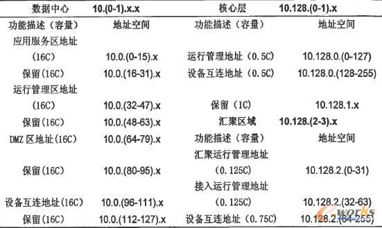 表2.3和表2.4是根據企業網絡規劃原則和企業擴張發展速度定義的IP地址空間范圍,將數據中心與功能區域地址劃分在2個128的B類網絡中。以上IP地址空間的規劃是企業網絡架構設計具有擴展延伸、地址冗余、清晰靈活、易于管理的重要基礎和組成部分。