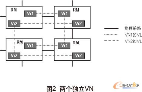 圖2是兩個獨立VN(VN1和VN2)的示意圖,圖中每個RM上有兩個不同的VR,VN1的VL和RM的物理鏈路是一致的,而VN2的VL則不同。虛擬資源和物理資源實現了相互邏輯獨立,虛擬網和底層網絡拓撲可以完全不同。VN可以根據需要調整其網絡拓撲,添加或刪除虛擬節點。同一個RM上的不同VR之間沒有直接聯系,相互隔離,各自屬于不同VN,處于拓撲的不同位置。
