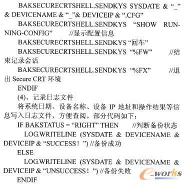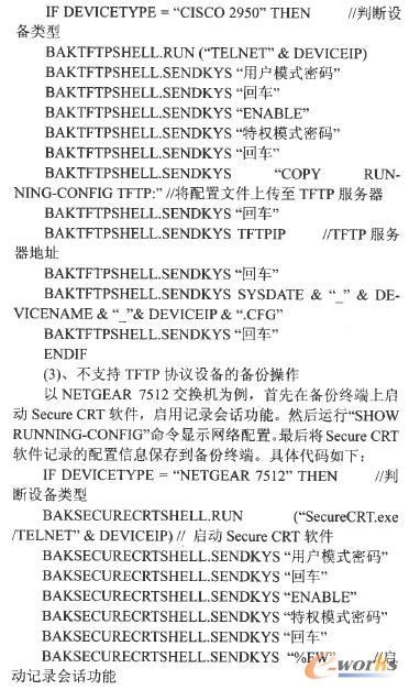 以CISc0 2950交換機為例,首先使用“ENABLE”命令進入設備的特權模式。然后執(zhí)行“COPY RUNING.CONFIGTFTP”命令將配置文件上傳到TFTP服務器。最后將設備配置文件保存到備份終端指定的備份目錄,備份的配置文件名稱由系統(tǒng)日期、設備名稱和設備IP地址共同組成。具體代碼如下: