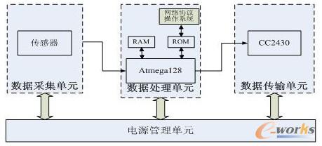 傳感器節點一般由數據采集單元、數據處理單元和數據傳輸單元以及電源管理單元等模塊組成[5]。節點硬件結構由圖2所示。微處理器ATmega128通過SPI總線和一些離散控制信號與RF收發芯片CC2430進行通信。