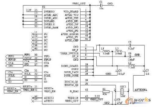 CC2430外圍電路如圖3所示。CC2430內部使用1.8V工作電壓,適合于電池供電的設備,外部數字I/O接口使用3.3V電壓,這樣可以保持和 3.3V邏輯器件的兼容型。它在片上集成了一個自流穩壓器,能夠把3.3V電壓轉化成1.8V電壓。這樣對于只有3.3 V電源的設備,不需要額外的電壓轉換電路就能正常工作。