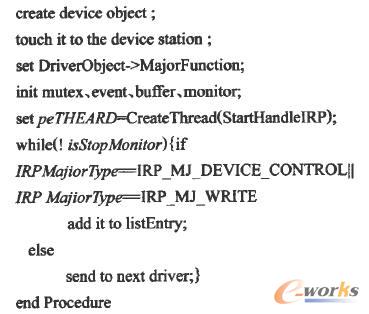 其中StartHandlelRP這個線程函數(shù)主要負責(zé)處理listEntry中的IRP包,只要listEntry不為空,就一直順序處理其中的IRP包。這樣,只要驅(qū)動監(jiān)控處于啟動狀態(tài),就能不斷截獲需要處理的IRP包置于隊列中順序處理。