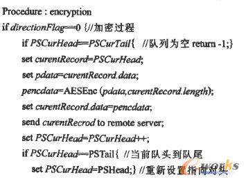 在網(wǎng)絡(luò)上傳輸?shù)臄?shù)據(jù)和RBC存儲的鏡像數(shù)據(jù)都是經(jīng)AES加密算法加密的密文,只有LBC存儲的是明文,加密發(fā)生在從LBC讀出數(shù)據(jù)封裝成備份記錄的過程中,而解密是在恢復(fù)過程中將從網(wǎng)絡(luò)接收到的備份記錄中的密文解密得到明文。在系統(tǒng)海量緩存中維護著兩個隊列,一個是讀出發(fā)送隊列SQuene,用于存儲有效數(shù)據(jù)為明文的備份記錄,需要加密后通過網(wǎng)絡(luò)通信模塊發(fā)送到災(zāi)備中心,另一個是接收隊列RQuene,用于存儲從災(zāi)備中心接收到的備份記錄,其中有效數(shù)據(jù)是密文,需要解密后根據(jù)任務(wù)對應(yīng)盤符、磁盤偏移off寫入磁盤,這兩個隊列共享海量緩存空間,都是單循環(huán)隊列,系統(tǒng)為每個隊列維護著兩個指針PCurHead、PCurTail,分別指向隊列的頭和尾,隊列為空的條件為PCurHead—PCurTail。算法描述如下: