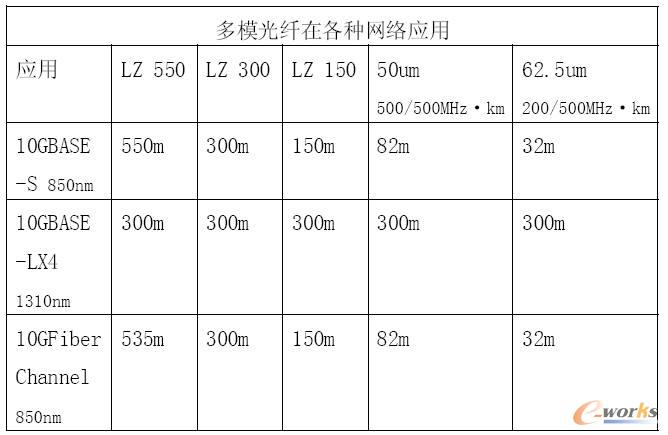 從表中可以看出在10GBASE-LX4 的通訊規格下,使用LZ 型光纖與50um/62.5um 多模光纖的傳輸距離都為300m,但LZ 型光纖色散率低,零色散率為0.101ps/nm·km,因此不需要加光纖衰減補償裝置,可降低網絡布線成本。
