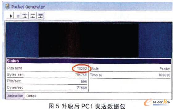 第2次使用物理端口設置IP地址、將SW1和SW2之間OSFP路由COST值調高到20,采用點到點類型。hello間隔由10s調整到1s,默認路由為鏈路A,斷開SW5-SW6之間鏈路后路由自動切換到鏈路B,再恢復SW5-SW6之間的鏈路,通過Sniffer發包(每s發送1000個包)。觀察路由恢復到鏈路A的時間,期間PC1發送10202個包,PC2收到9909個包,包大小為74個字節,發送和接收包數址相差293個,經過計算,路由恢復時間約0.293s,ping沒有丟包現象,測試截圖如圖5和圖6所示。