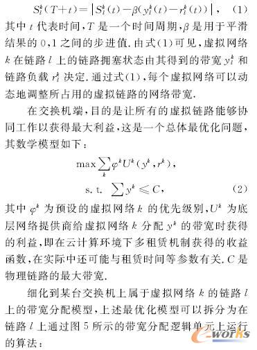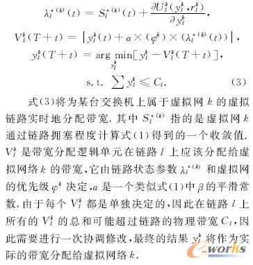 其中t代表時間,T是一個時間周期,口是用于平滑結果的O,1之間的步迸值。由式(1)可見,虛擬網絡k在鏈路l上的鏈路擁塞狀態由其得到的帶寬ykl和鏈路負載rkl決定。通過式(1),每個虛擬網絡可以動態地調整所占用的虛擬鏈路的網絡帶寬。