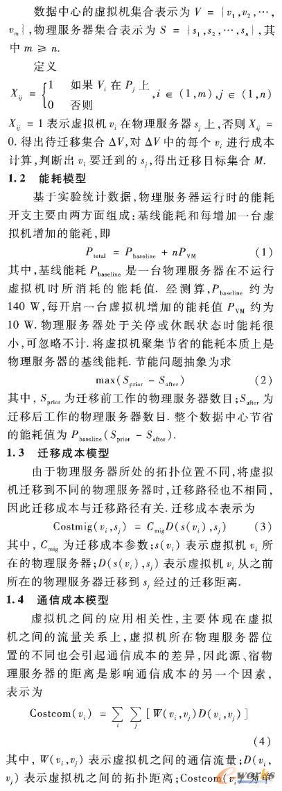 節能問題已成為數據中心運營的重要問題,目前的研究通常將處在不同物理服務器上的虛擬機進行聚集,從而關停或休眠遷空的物理服務器實現節能,該問題被抽象為NP問題,采用啟發式方法來確定虛擬機的放置位置,典型地,將其抽象為裝箱問題,僅從虛擬機的數目出發使用裝箱算法進行遷移判斷,并不考慮通信成本和遷移成本,因此會造成整個數據中心通信成本的提高,進而影響性能。