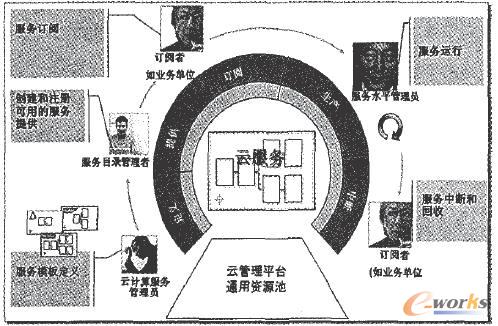 在整個服務的生命周期包括兩類參與角色:終端用戶即服務訂閱者;云平臺運營管理用戶,包括云計算平臺管理員、服務目錄管理者和服務水平管理員。
