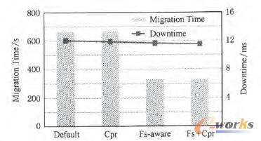 本節綜合比較快速全系統在線遷移(Fast)和傳統全系統在線遷移(Default)的性能。快速全系統在線遷移使用上述3個關鍵技術,傳統全系統在線遷移遷移磁盤時采用黑盒方式,并且不使用壓縮;遷移內存時引入目前最先進的多線程壓縮方法,以便和異或壓縮比較。
