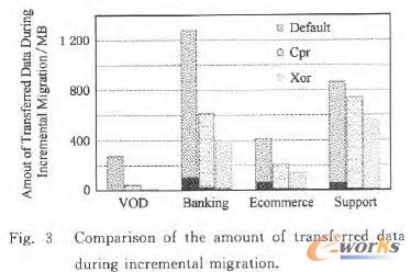 圖3的同一系列中,深色表示磁盤映像數據量,淺色表示內存映像數據量。由于文件系統緩存的作用,大多數應用在增量遷移過程中改變的磁盤映像都不多,至多占增量遷移總量的15.67%(Ecommerce):.因此,影響增量遷移時間和停機時間的關鍵,仍然在于內存映像的遷移。