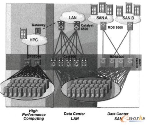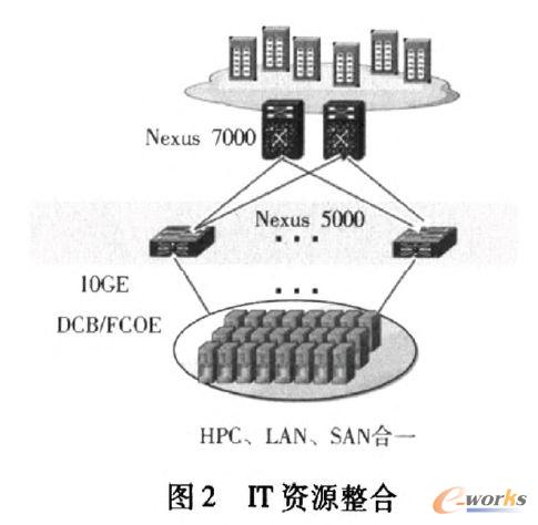 要形成云計算的資源池,必須使所有IT資源共享化,這就是資源的整合化。使用統一交換技術,將傳統數據中心存在的三種網絡(使用光纖存儲交換機的存儲交換網絡即Fiber Channel SAN,便于實現CPU、內存資源并行化處理的高性能計算網絡即多采用高帶寬低延遲的InfiniBand技術,以及傳統的數據以太網技術)形成的資源豎井打破,使用Fiber Channel Over Ethemet(FCoE)標準協議構建統一的IT資源統一交換如圖2所示。