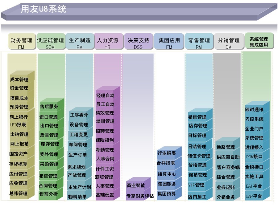 ² 用友U8在廣泛考慮企業價值流模型基礎上,全面集成了財務、生產制造和供應鏈應用,延伸客戶管理至客戶關系管理(CRM),并對于零售、分銷領域實現了全面整合。通過實現人力資源管理(HR),辦公自動化(OA),保證行政辦公事務、人力管理和業務管理的有效結合。
