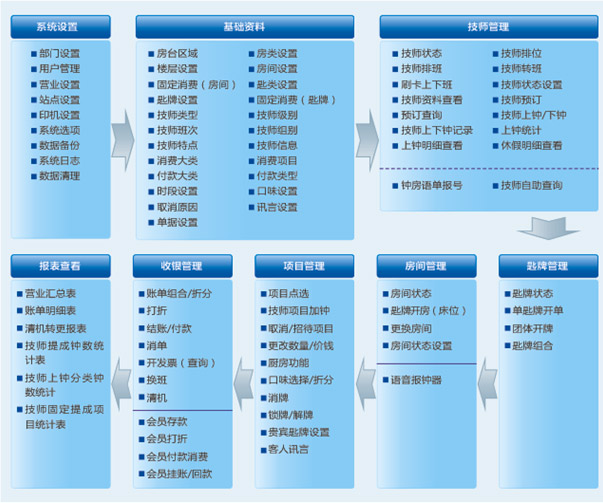 通過集團總部對門店的權限及分工管理,門店的信息化應用取代了企業大部分的人力工作(如:客人到店后通過大屏幕了解技師的上鐘狀態,并可以直接點技師,同時技師房與出品部收到相關信息并報號,當客戶到房間時技師與小食已經在房間等候)。鐘房管理可按預設的規則對技師進行輪、排,消除技師之間的疑慮。且房間都設有語音報鐘設備,當技師上鐘必須刷技師卡確認,并在到點時通過語音報鐘器通知下鐘。系統通過語音報鐘器會自動記錄技師信息,財務無需人工統計,只要打開電腦所有的營業數據、技師提成等相關報表即呈現出來。