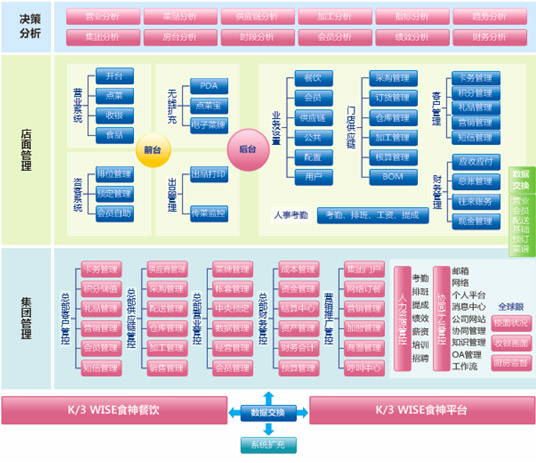 金蝶K/3 RISE ERP食神餐飲連鎖版:金蝶 K/3 WISE酒樓連鎖行業管理解決方案針對當前餐飲酒樓連鎖企業運營的需求,通過建設分店的信息管理系統解決店面的運營問題,通過集團會員管理模塊、集團中央配送模塊、集團營業管理模塊解決企業的會員、配送和門店營業的遠程集中管控,通過數據交換平臺實現分店和總部之間的數據交換,為企業提供有效、準確、及時的業務分析數據,從而保證企業做出準確的經營決策