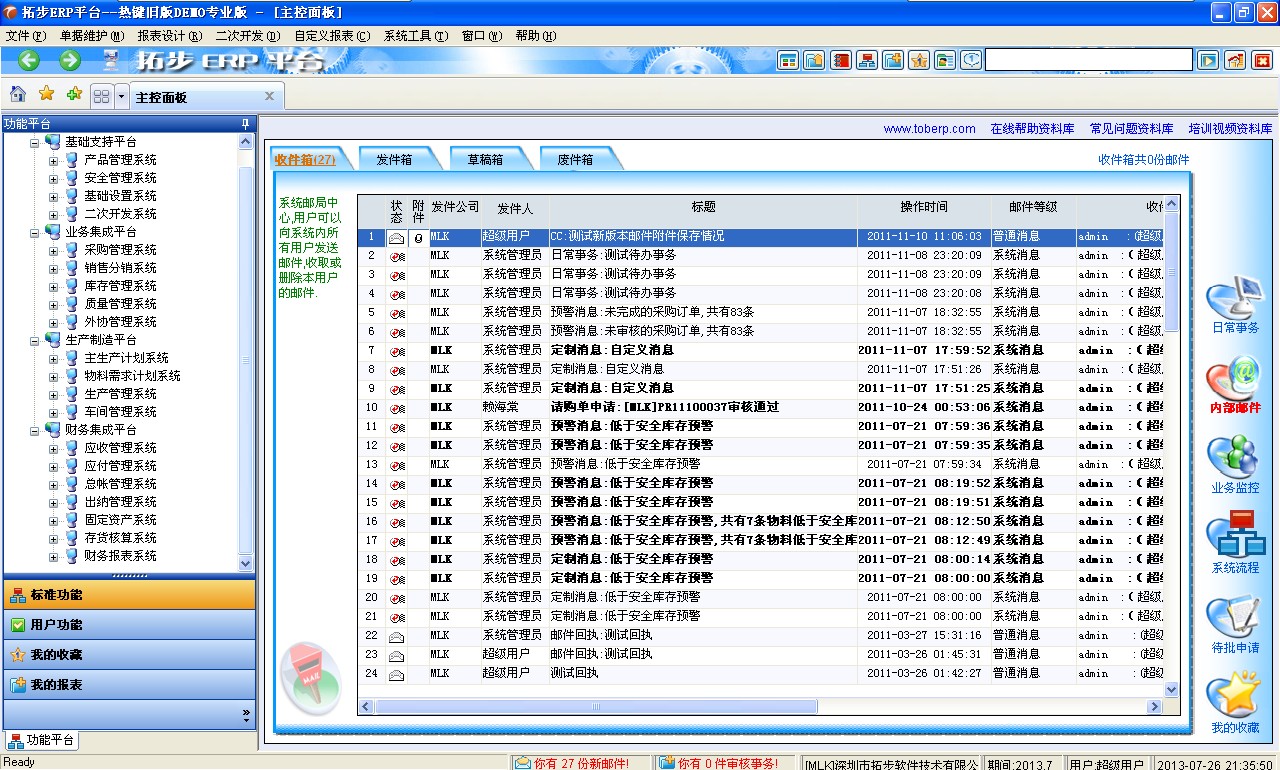拓步ERP平臺系列專業版--包括拓步ERP平臺的產品管理系統、安全管理系統、基礎設置系統、二次開發系統、銷售管理系統、采購管理系統與庫存管理系統,主生產計劃(MPS)、物料需求計劃(MRP)、生產管理系統、車間管理系統,以及應收帳款系統與應付帳款系統、財務總帳系統、出納管理系統、固定資產系統、存貨核算系統、財務報表系統等。