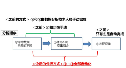 以往“依條件篩選數據”與“多項變量的組合”,都必須依靠具備專業知識的分析人員手動操作。例如,在進行零售業的銷售預測時,統計分析不同門店的銷售趨勢后,以一星期7天、不同天氣等條件為分析基礎,都必須由分析人員反復依靠條件篩選數據。此外,對于某一商品而言,重要的變量分析組合,可能為不同種類的商品銷售帶來哪些影響,在調查此類情形時,分析人員也必須事先針對各項商品提出假設,而后進行評價。
