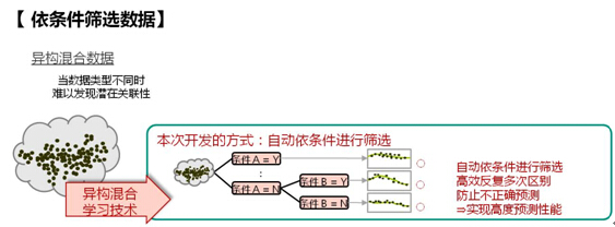“異構混合學習技術”能夠發現混合存在于大數據中的多個關聯性,同時將所發現的關聯性分解為多個簡單式,并針對分析目標,組合相關變量后進行分析,實現高度預測與判斷。