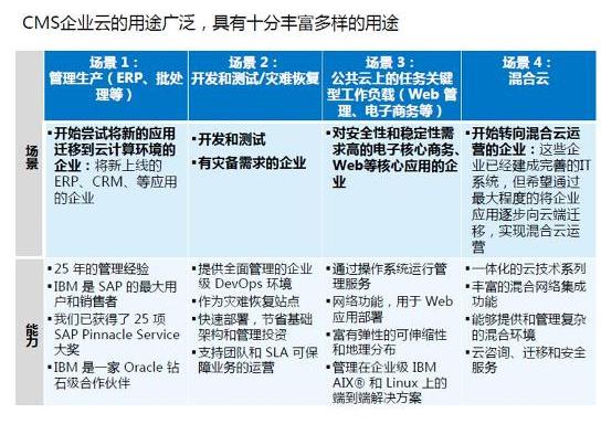 值得一提的是,那些對橫向拓展要求較高,彈性計算資源伸縮幅度較大的企業應用,并不適合CMS,穩定高效、高安全性企業級關鍵應用即服務才是CMS的重點。那么CMS到底面向哪些企業、哪些行業?IBM對此總結出四個主要的應用場景,如表1所示: