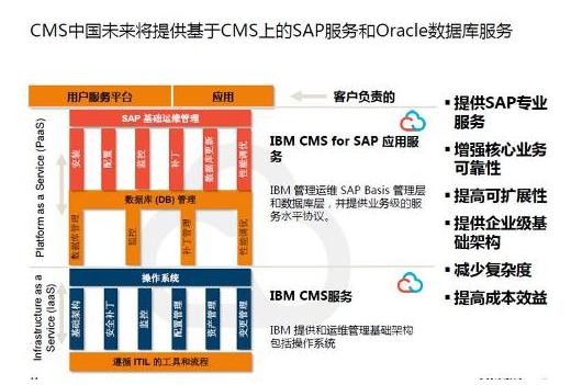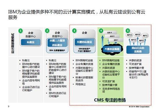 另一方面,IBM一直為傳統大中型企業客戶提供復雜服務,以滿足關鍵業務與核心應用的需求,“IBM即服務”闡述的就是IBM的核心能力與發展方向。當IBM提供企業級的云服務時,企業級的技術能力、長期的外包服務經驗,以及對企業行業應用的理解都是互聯網云服務商所不能比擬的優勢。因為,最基本的企業需求沒有變,無論數據中心資產是否屬于企業用戶,云服務提供商都一樣需要圍繞計算、存儲、網絡、安全四大基礎元素,改變的僅僅是交付方式。應該說,云服務不僅可以用來支持Web、移動等新型應用,也可以支持開發測試、異地災備,還應該支持企業的辦公自動化、ERP/CRM、數據庫等傳統業務。CMS的出現向上拓展了云服務的范圍,并從金字塔尖的共享云服務模式開始向下滲透,IBM在企業級云服務上更多的是做減法。