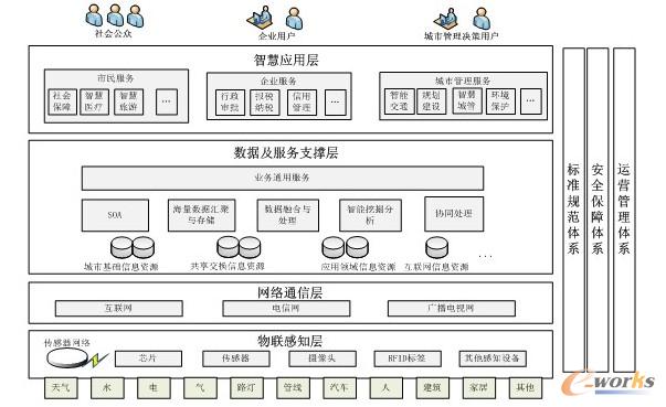 本次會(huì)議初步提出了智慧城市基礎(chǔ)參考模型和智慧城市標(biāo)準(zhǔn)體系。其中,智慧城市基礎(chǔ)參考模型(如圖1示)主要分為物聯(lián)感知層、網(wǎng)絡(luò)通信層、數(shù)據(jù)及服務(wù)支撐層及智慧應(yīng)用層。智慧城市標(biāo)準(zhǔn)體系(如圖2示)包括智慧城市總體標(biāo)準(zhǔn)、智慧城市技術(shù)支撐與軟件標(biāo)準(zhǔn)、智慧城市運(yùn)營(yíng)及管理標(biāo)準(zhǔn)、智慧城市安全標(biāo)準(zhǔn)、智慧城市安全標(biāo)準(zhǔn)、智慧城市應(yīng)用標(biāo)準(zhǔn)由五個(gè)類別的標(biāo)準(zhǔn)組成。后續(xù),SOA分委會(huì)將組織更多成員單位編寫(xiě)《我國(guó)智慧城市標(biāo)準(zhǔn)體系研究報(bào)告》。