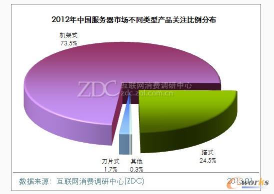 在不同類型服務器關注比例走勢上,2012年適用范圍最廣的機架式服務器產品為用戶關注的絕對主流,獲73.5%的關注比例。塔式服務器次之,關注比例為24.5%。刀片式服務器較低,僅為1.7%。