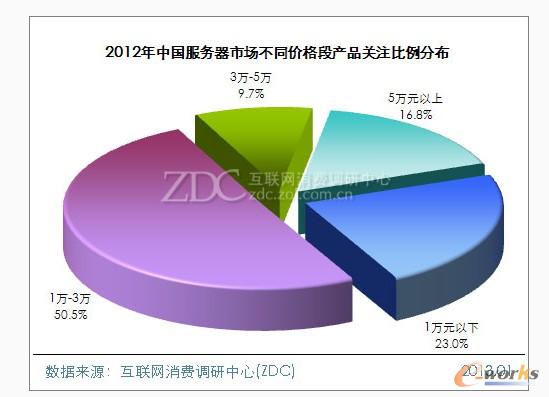 在不同價格段的服務器產品中,2012年服務器市場上售價在1萬-3萬元價位的產品用戶關注度集中,達50.5%,其次是1萬元以下產品,關注比例達23%。5萬元以上產品關注比例為16.8%,3萬-5萬元產品關注比例相對較低,不足10%。