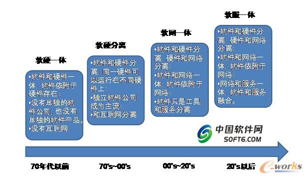 曹開彬認(rèn)為,縱觀軟件產(chǎn)業(yè)的發(fā)展,軟件會(huì)經(jīng)歷四次變異,即軟硬一體、軟硬分離、軟網(wǎng)一體,和軟服一體。