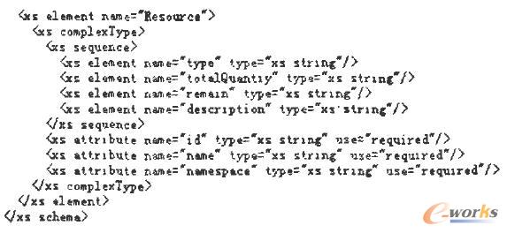 通過以上的模型就可以在生產車間原有的信息系統之上,獲取生產過程和資源進行服務和資源建模,把服務依賴的資源進行等級評判,通過SOA的XML描述方法對原有的系統進行功能擴展。XML描述通過制定的Schema文件即可獲取需要的資源和服務,并且發布該信息,圖2和圖3分別為資源和服務的Schema文件。對資源和服務的描述中使用資源統一標識符(UUID)進行標示,實現服務和資源的統一管理,為后續的資源和服務調用提供基礎平臺。