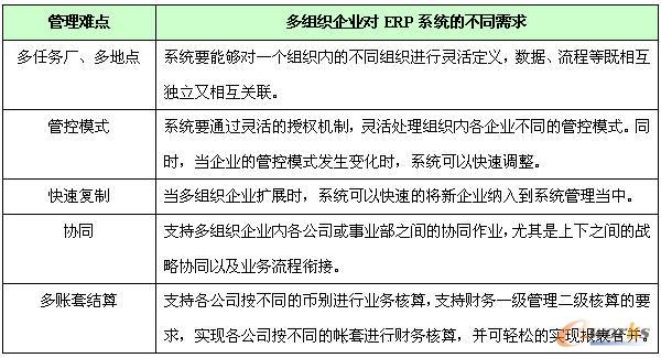 多組織化企業(yè)與單組織企業(yè)的管理相比,要復(fù)雜的多,多組織化企業(yè)必須要處理多任務(wù)廠之間的協(xié)同作業(yè),多組織之間的財(cái)務(wù)核算,資金流、物流、信息流、工作流分離的管理模式等問題,而這些管理要求也造成了多組織應(yīng)用架構(gòu)的ERP與單組織應(yīng)用架構(gòu)的ERP系統(tǒng)之間最大的區(qū)別。當(dāng)然,如果是集團(tuán)化的多組織企業(yè),ERP還要能靈活的處理不同集團(tuán)企業(yè)的管控模式。
