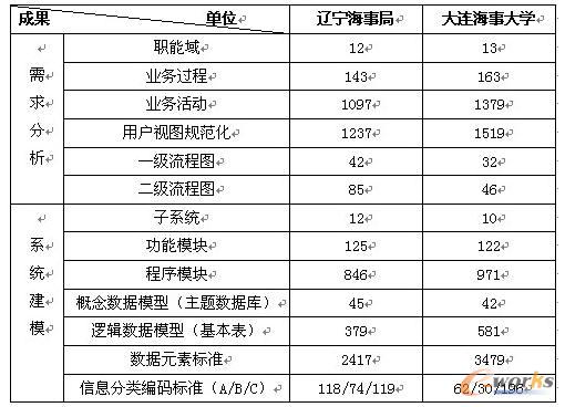 遼寧海事局是為建立全局數據中心和統一的信息平臺而進行信息資源規劃的,大連海事大學是為建立綜合校務管理信息系統而進行信息資源規劃的,兩單位信息資源規劃的主要成果統計如表2所示。