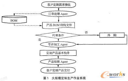 在實踐中,應(yīng)用大規(guī)模定制生產(chǎn)方式的企業(yè)并非所有的環(huán)節(jié)都是按照客戶的定制化需求進行生產(chǎn),一般大規(guī)模定制企業(yè)生產(chǎn)作業(yè)系統(tǒng)主要由訂單處理系統(tǒng)、零件生產(chǎn)系統(tǒng)、產(chǎn)品組裝系統(tǒng)3個部分組成。首先,根據(jù)物料清單將訂單進行分解成基本的產(chǎn)品結(jié)構(gòu)樹,然后根據(jù)加工過程中的約束條件進行判斷,是否需要外購定制產(chǎn)品的基本構(gòu)件,其中約束條件通常是加工能力約束、庫存水平約束、生產(chǎn)成本約束、用戶指定用料約束以及產(chǎn)品交付期約束等,在不滿足約束條件時需要對一些基本構(gòu)件進行外購,滿足條件則自行組織生產(chǎn),最后將產(chǎn)品構(gòu)件組裝成為客戶定制的產(chǎn)品。