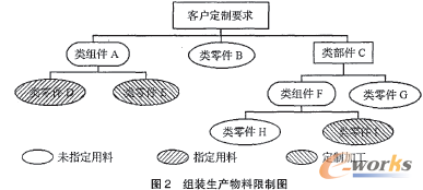 從裝配的角度看,產(chǎn)品族的結(jié)構(gòu)可以分為產(chǎn)品類、部件類、組件類和零件類,每種規(guī)格的產(chǎn)品依據(jù)不同顧客需求有不同的物料組合,其中物料主要由顧客指定用料和非指定用料所組成,某些顧客可能會指定專用的物料組合,而某些顧客則認為混料也可以接受 (圖2),但為了保證加工的連續(xù)性和交付產(chǎn)品的同質(zhì)化,通常同一訂單的同一道工序只能采用相同的物料。