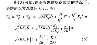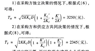 即供應(yīng)鏈環(huán)境下決策時供需雙方總費用小于供需雙方各自單獨決策時所需總費用.說明只有在供應(yīng)鏈環(huán)境下綜合考慮供需各方的總費用和效益才能保證整個供應(yīng)鏈中的所有企業(yè)在長遠發(fā)展中取得最佳利益。