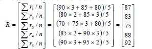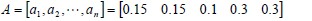 現假設價格、時間、地點、質量和數量的權重依次為0.15、0.15、0.1、0.3、0.3,則可以得到權重矩陣為: