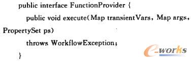 在EleFlow中,函數function是用來定義(引用)并執行外部的商業邏輯和服務,實現EleFlow與外部具體的應用之間交互。當系統有額外的需求和功能,例如處理“角色”、“任務分配”、“提交任務”等諸如此類的操作,就擴展function接口。