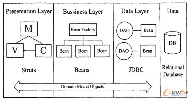 物資管理系統(tǒng)總體結(jié)構(gòu)分為三個(gè)層:表現(xiàn)層,業(yè)務(wù)層,數(shù)據(jù)層,應(yīng)用了MVC開發(fā)模式。軟件技術(shù)架構(gòu)如圖4。