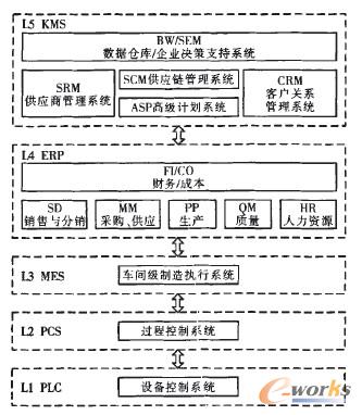這5層系統(tǒng)相互集成、相互協(xié)調。上面一層控制下面一層,下面一層向上面一層反饋運行信息,構成一個完整的企業(yè)信息化管理系統(tǒng)。