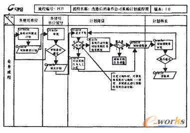 設(shè)備備件公司采購管理流程經(jīng)過幾次的改造和優(yōu)化,已經(jīng)形成一個比較成熟和完善科學(xué)管理體系,并且采用了相對比較完善的計算機(jī)信息管理系統(tǒng)來完成采購任務(wù),備件管理的全過程。原有的備件采購管理信息系統(tǒng)是由內(nèi)部人員用Delphi 6.0自行開發(fā),后臺數(shù)據(jù)庫用大型數(shù)據(jù)庫Oracle8i,軟件架構(gòu)為C/S兩層模式,首先制造部門的計劃管理人員根據(jù)實際生產(chǎn)所需,在系統(tǒng)上申報所需物料,經(jīng)過制造部門的相關(guān)審核人員審核后,計劃提交采購部門的主管,并會由系統(tǒng)產(chǎn)生物料相關(guān)的信息,例如:價格、庫存現(xiàn)有量、在途數(shù)量等,這些信息將提供給采購部門的計劃審批人員,為他們審批計劃提供相關(guān)的依據(jù)。經(jīng)過審批的計劃,將會重新分配組合后,分發(fā)給相關(guān)的采購人員做采購計劃,再交給管理層審批,審批后,采購人員進(jìn)行詢價、報價之后做采購申請,采購申請經(jīng)管理層人員審批后,與供應(yīng)商簽訂采購合同,物料到貨后,將在系統(tǒng)中做到貨的登記及驗收,驗收合格的物料將在結(jié)算員處做合同入庫和財務(wù)承付通知,同時,倉儲管理人員可以辦理倉庫的入庫和出庫手續(xù)。其結(jié)構(gòu)流程如圖1、圖2、圖3。