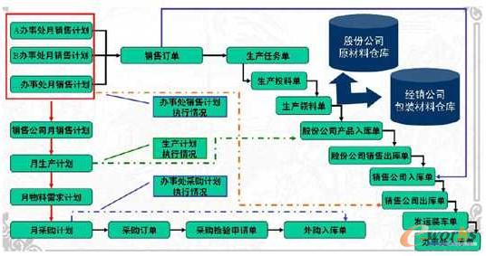 從上圖可以看出,河套酒業包括股份公司、生產公司、銷售公司、辦事處等獨立核算的實體或分子公司,但是實際上整個供應鏈系統是完全集成在一起的。孤立的解決上述問題,只能帶來重復工作量、公司間相同業務不一致以及滯后、市場反應不及時等問題。因此跨公司實體,實現銷售計劃、生產計劃、采購計劃三大計劃集成、物流集成是白酒類生產企業供應鏈系統信息化的關鍵。